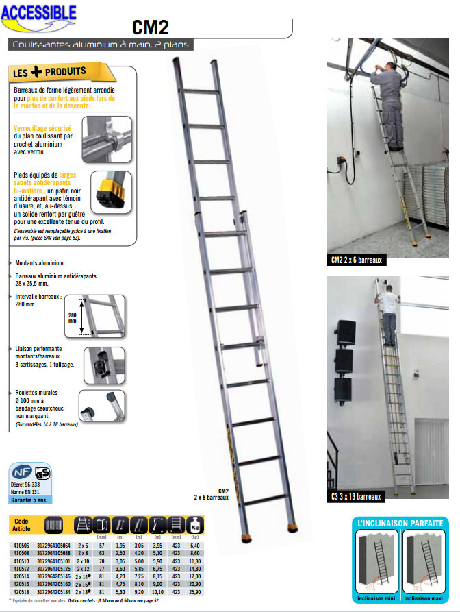 Echelle aluminium coulissante à main 2 plans en aluminium pour les travaux de moyenne hauteur.