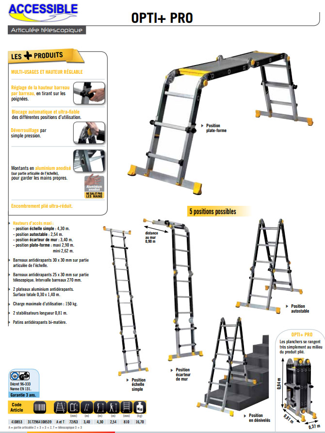 Echelle articulée en aluminium anodisé multi-usages à hauteur réglable.